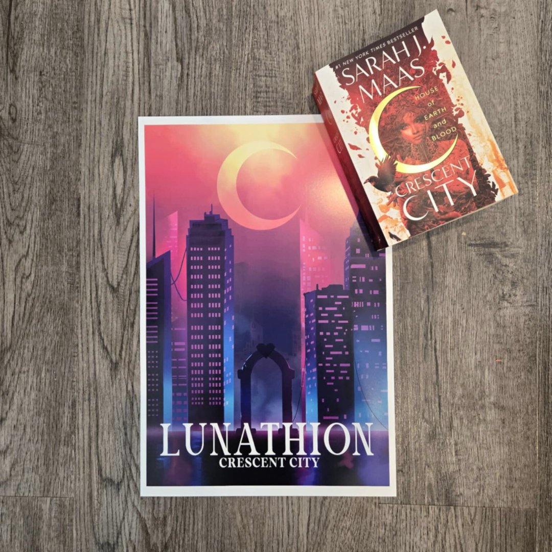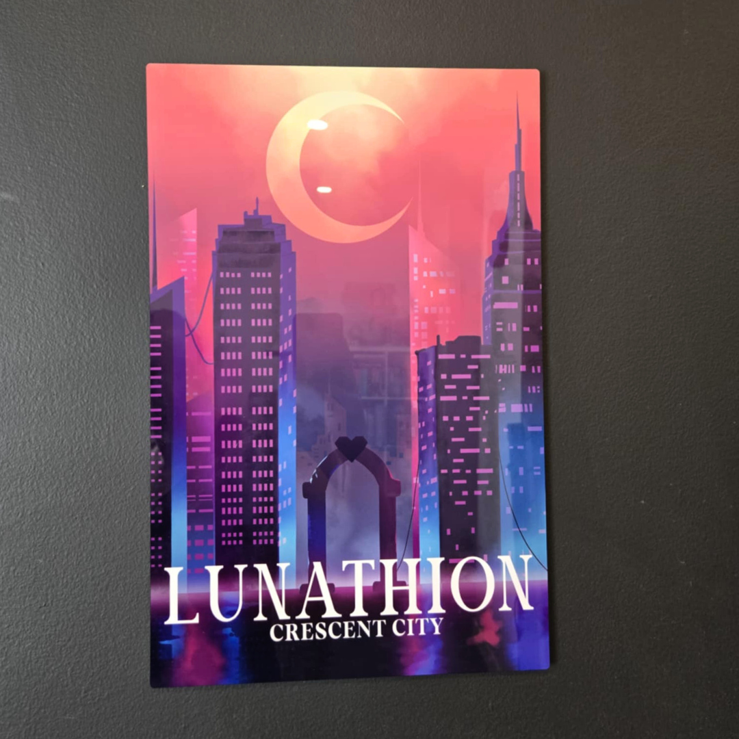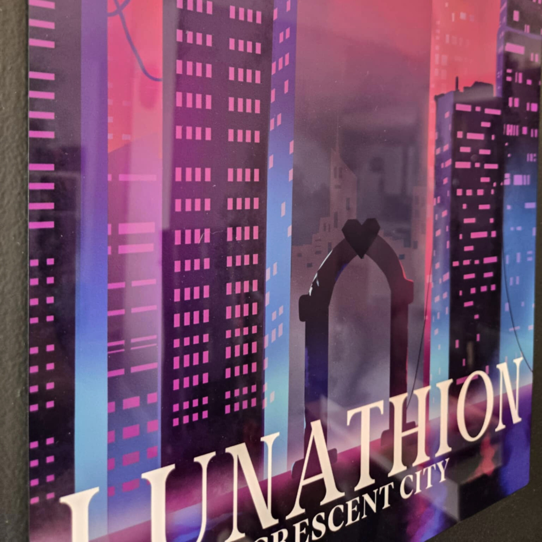 Step into the vibrant world of Lunathion, the city of angels, demons, and magic, with this breathtaking digital art print inspired by Sarah J. Maas' Crescent City series. This high-quality artwork brings to life the mystical beauty of the bustling cityscape, with glowing lights, towering buildings, and a sky filled with ethereal wonder. Fans of the Crescent City series will love adding this enchanting piece to their collection. Available in both satin gloss cardstock for a subtle finish or high-gloss metal for a radiant, polished look, each print is designed to make the vivid colors and intricate details stand out.